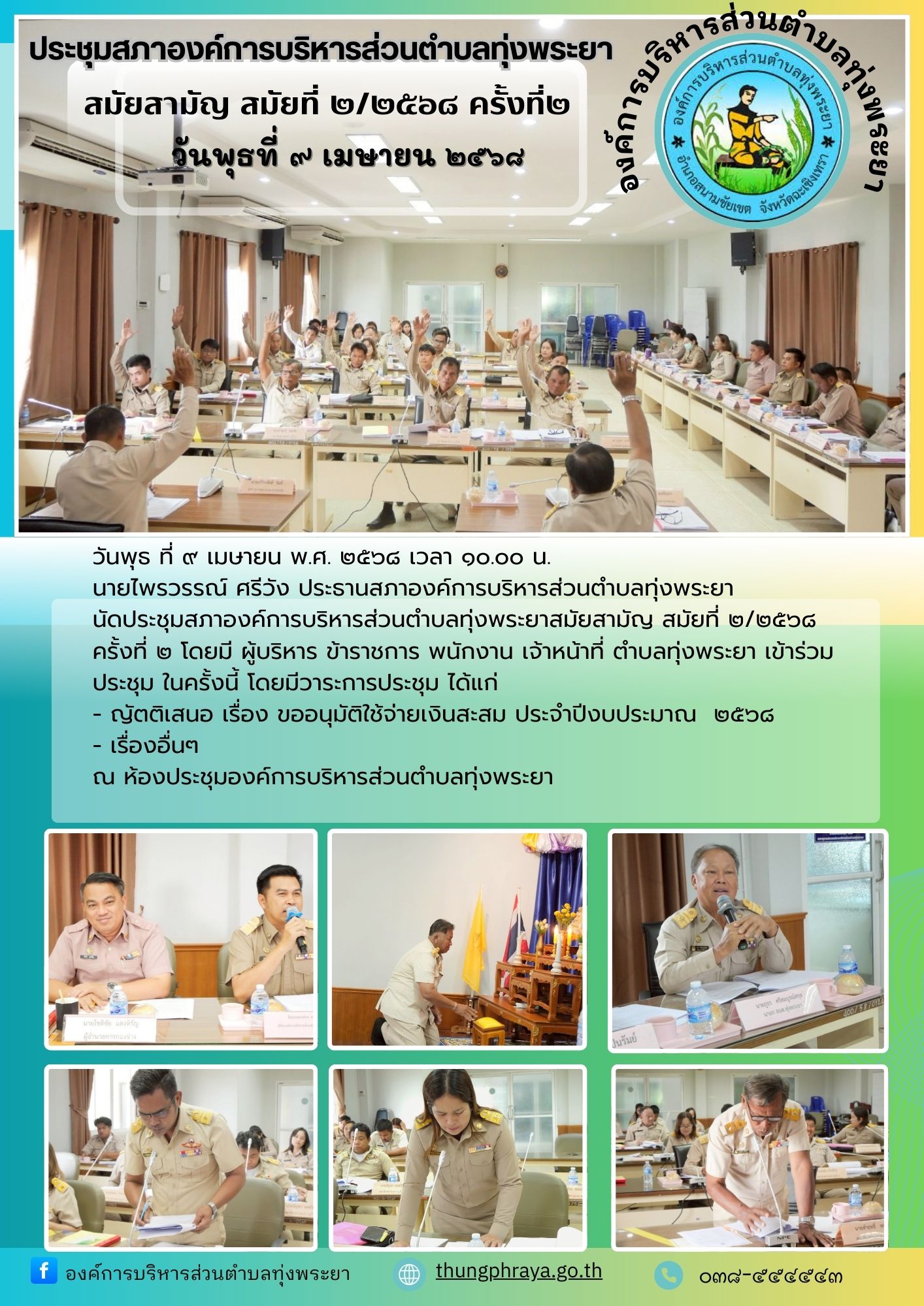 วันพุธ ที่ ๙ เมษายน พ.ศ. ๒๕๖๘ เวลา ๑๐.๐๐ น. นายไพรวรรณ์ ศรีวัง ประธานสภาองค์การบริหารส่วนตำบลทุ่งพระยา นัดประชุมสภาองค์การบริหารส่วนตำบลทุ่งพระยาสมัยส...