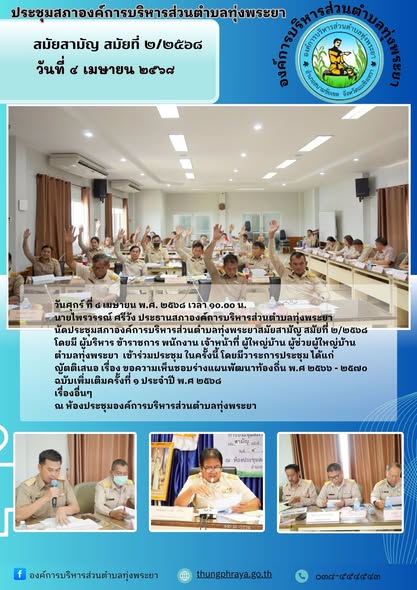 วันอังคารที่ ๘ เมษายน ๒๕๖๘ นายภูธรศรีสมบูรณ์สกุล นายกอบตทุ่งพระยา มอบหมายให้ นายต่อ พิศาลสาสน์ เลขานุการนายกอบต.ทุ่งพระยา สิบเอกณรงค์กร ศาสนา ปลัดอบตท...