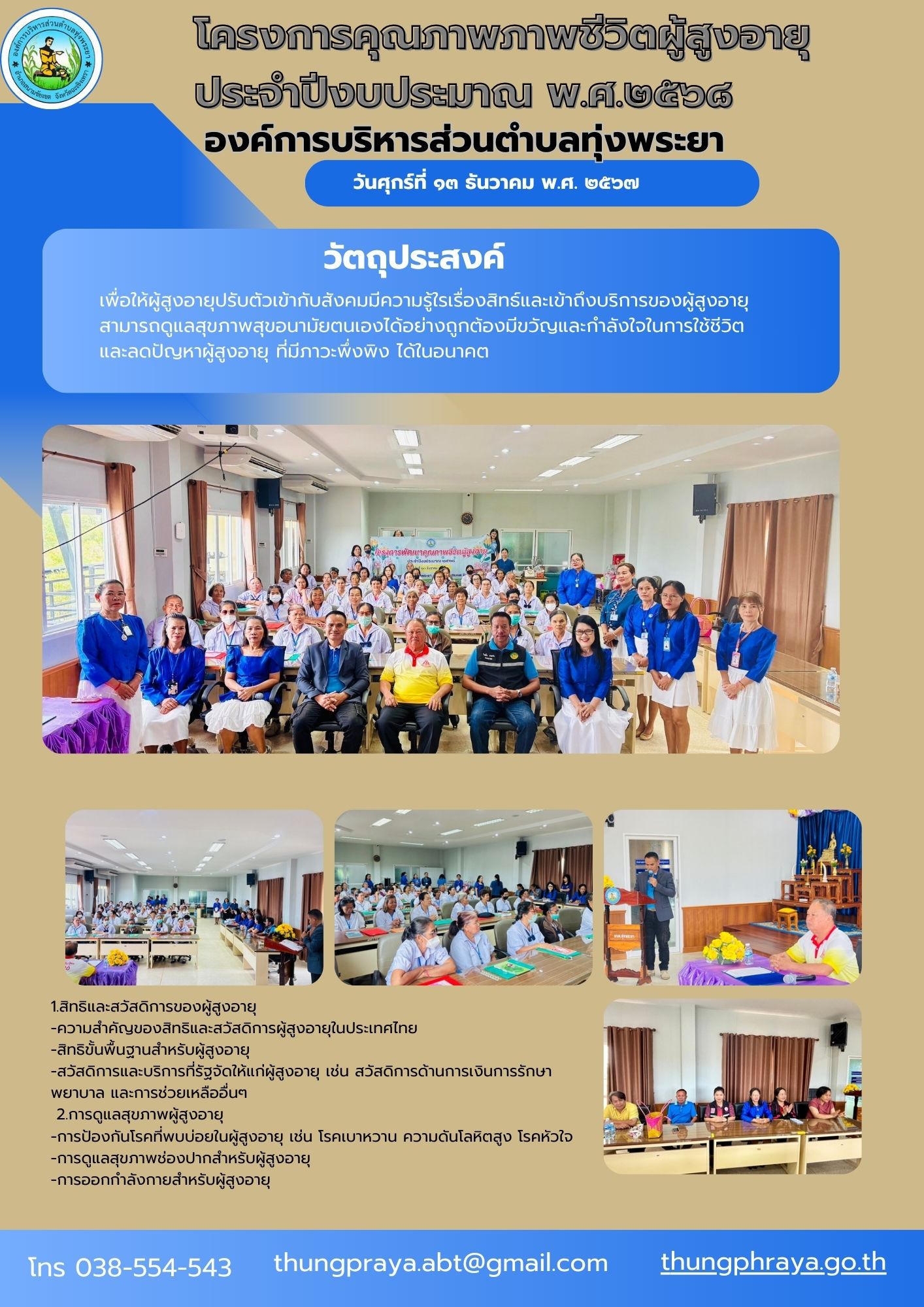 วันศุกร์ที่ ๑๓ ธันวาคม พ.ศ. ๒๕๖๗ นายภูธร ศรีสมบูรณ์สกุล นายกอบต.ทุ่งพระยาเป็นประธานในพิธีเปิดโครงการพัฒนาคุณภาพภาพชีวิตผู้สูงอายุ ประจำปีงบประมาณ พ.ศ....