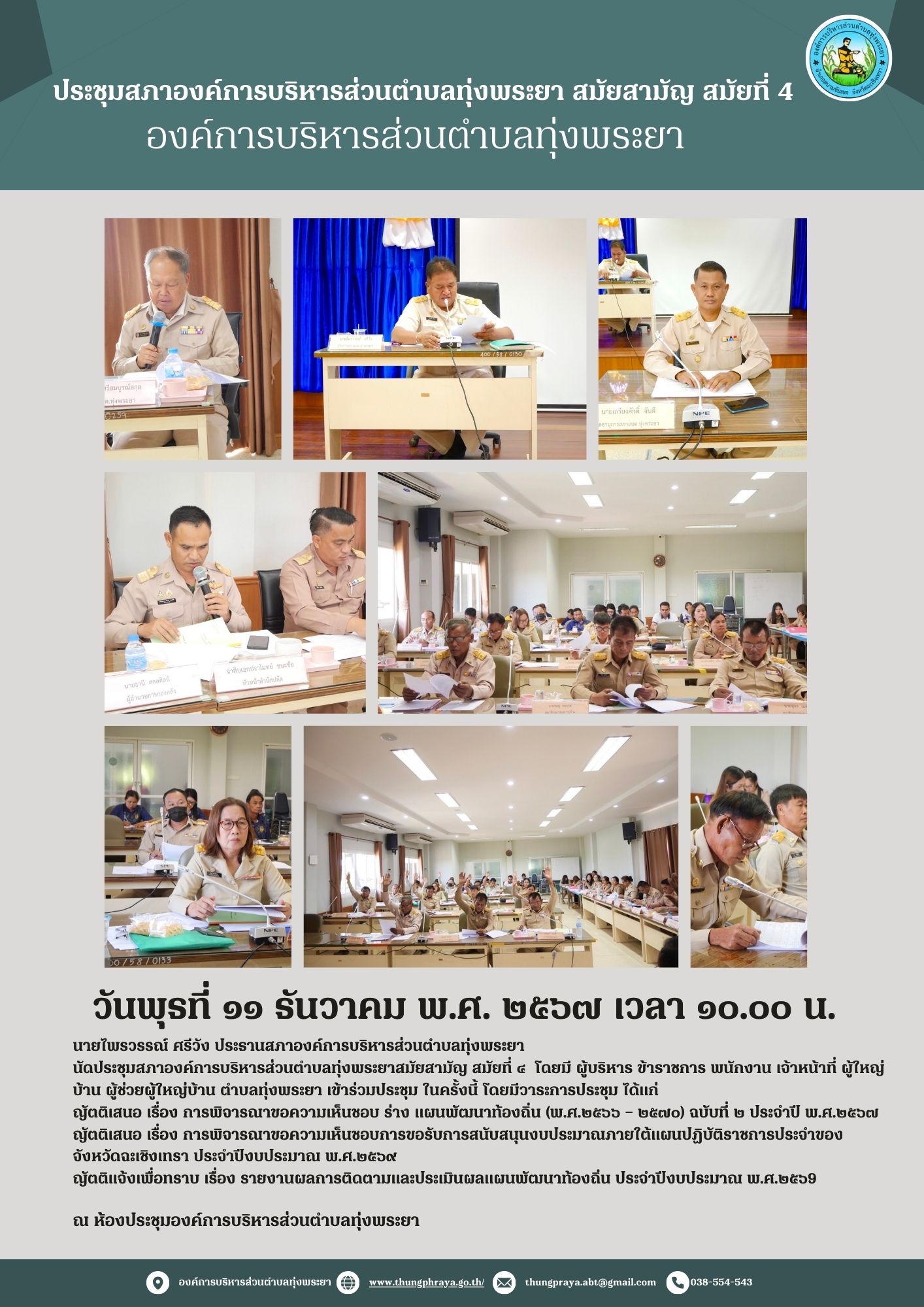 วันจันทร์ ที่ ๒๓ กันยายน พ.ศ. ๒๕๖๗ นายภูธร ศรีสมบูรณ์สกุล นายก อบต.ทุ่งพระยา และคณะผู้บริหาร ข้าราชการ กำนัน พนักงานเจ้าหน้าที่องค์การบริหารส่วนตำบลทุ...