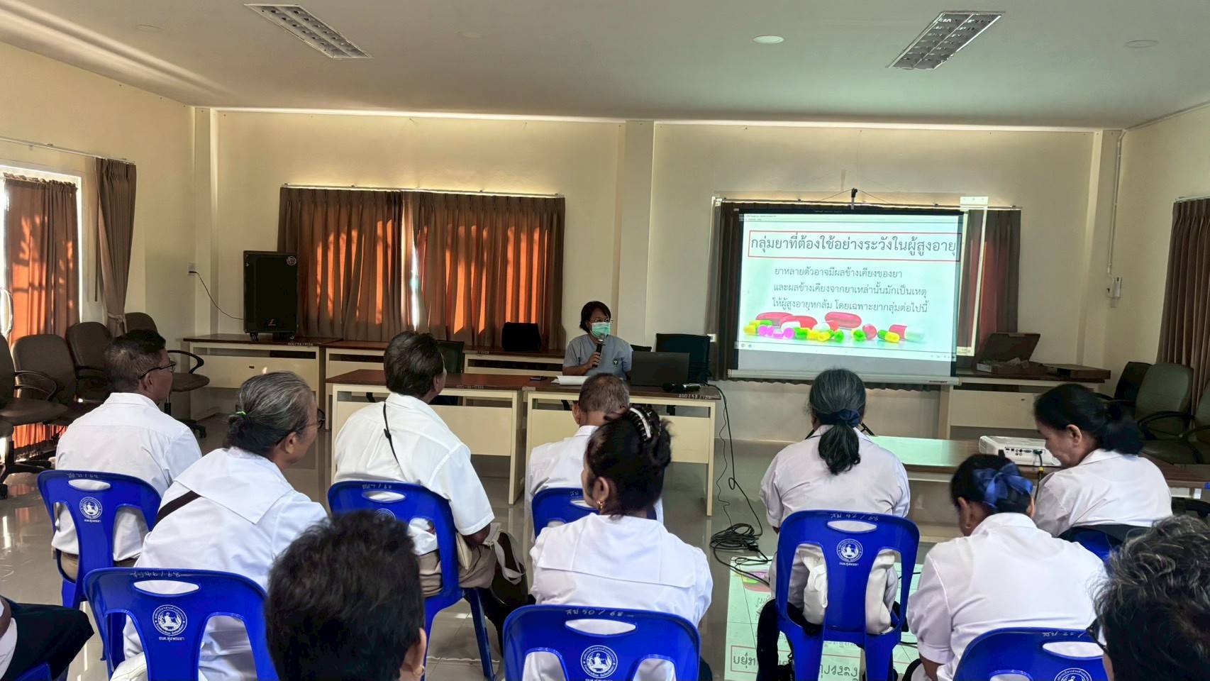 - วิชาข้อควรระวังในการใช้ยาในผู้สูงอายุ พร้อมยกตัวอย่างยาที่ต้องระวังเป็นพิเศษ และเปิดโอกาสให้ซักถามปัญหาในชีวิตประจำวัน